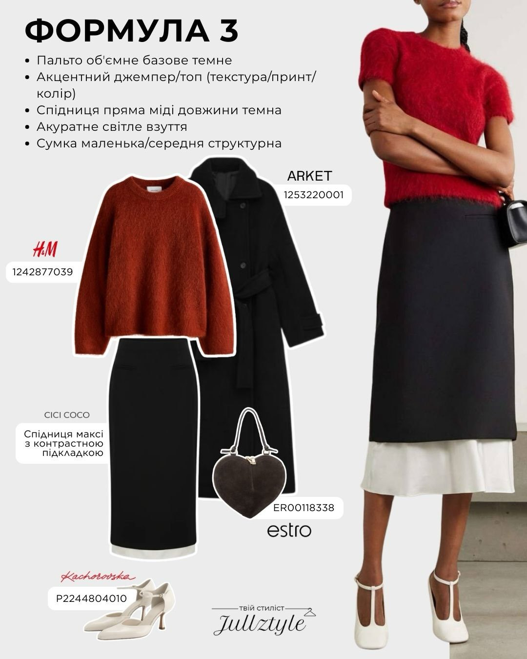 Контраст чорного та червоного - один із найефектніших прийомів весни. Об’ємне темне пальто поєднується з фактурним джемпером (ангора або мохер), а прямий силует спідниці міді додає стриманості.