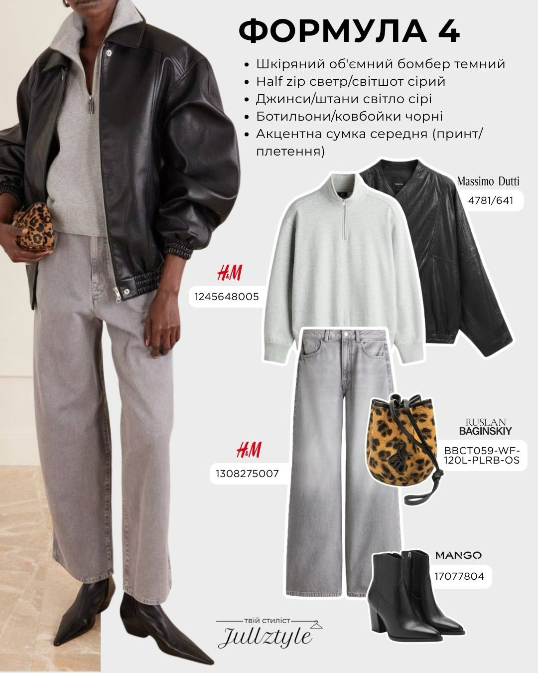 Для прохолодної погоди підійде багатошаровість. Об’ємний шкіряний бомбер носять поверх сірого светра на блискавці. Світло-сірі джинси формують єдину вертикаль кольору.
