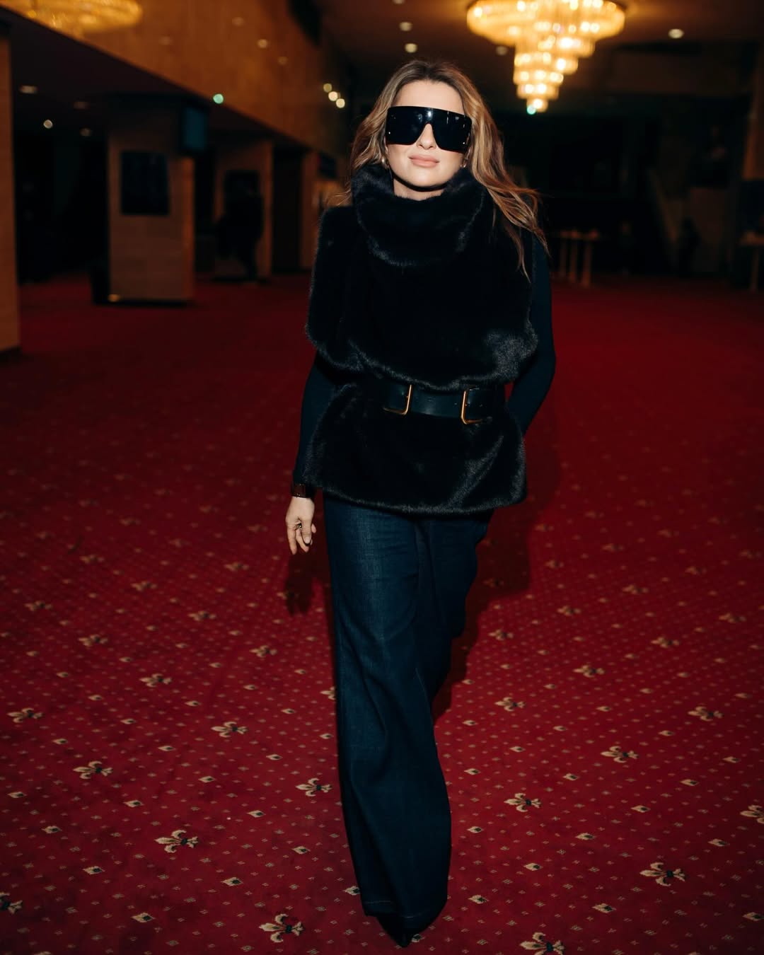 Попри об’ємність верхнього шару, силует не виглядає перевантаженим. Секрет - у грамотному акценті на талії. Співачка підкреслила фігуру широким шкіряним ременем із золотистою фурнітурою. Цей нюанс став критично важливим: ремінь структурує образ, формує жіночний силует і не дозволяє хутру "поглинути" пропорції.