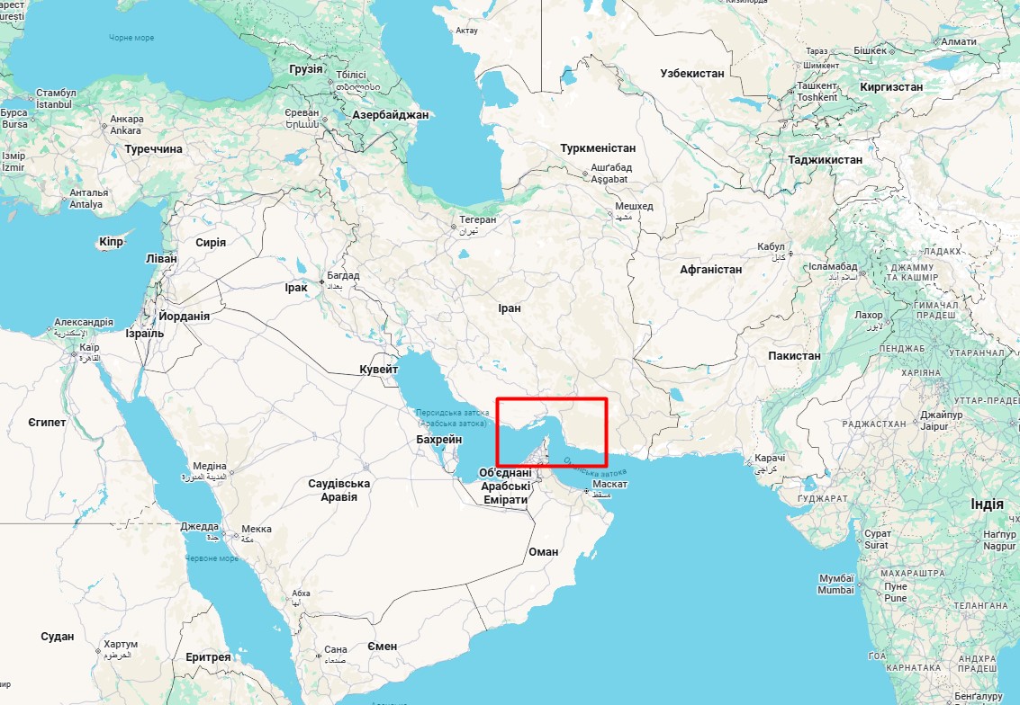 Фото: де розташована Ормузька протока (скриншот Google Maps)