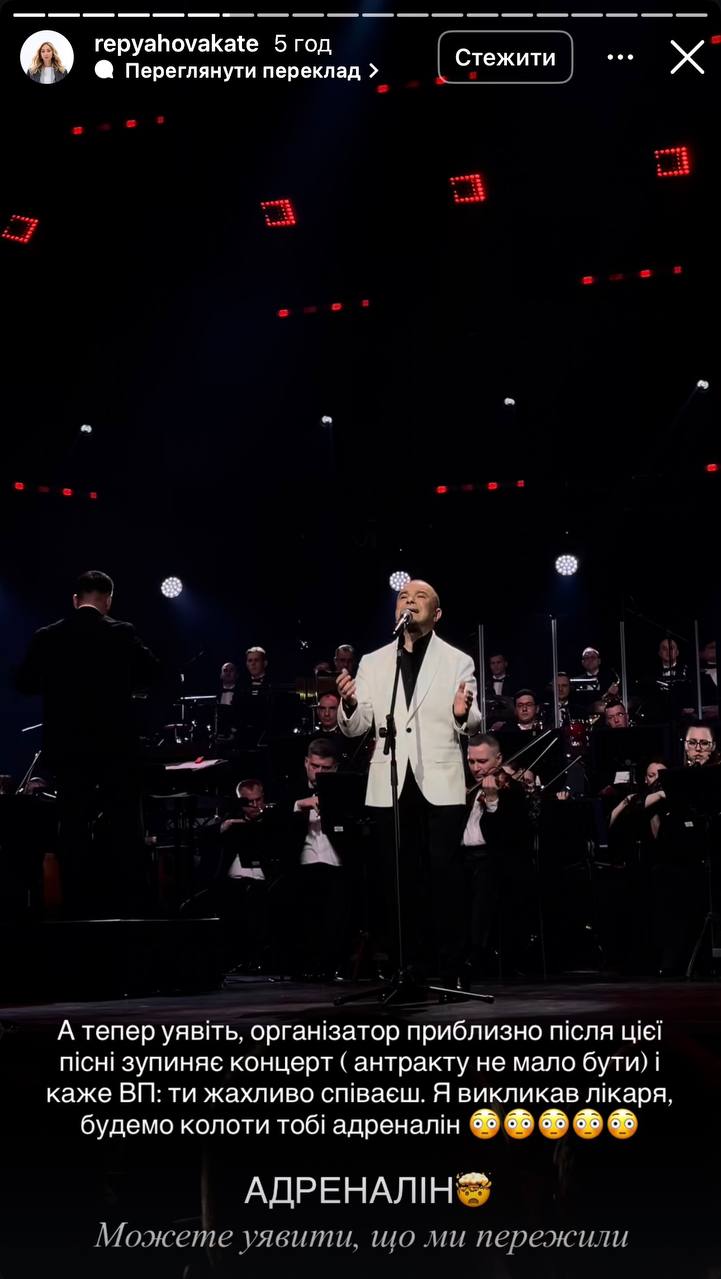 "А тепер уявіть, організатор приблизно після цієї пісні зупиняє концерт ( антракту не мало бути) і каже ВП: ти жахливо співаєш. Я викликав лікаря, будемо колоти тобі адреналін... Можете уявити, що ми пережили" - написала Катерина.