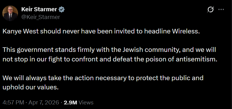 Раніше в мережі критично висловлювалися щодо виступу репера на фестивалі з огляду на його минулі антисемітські та пронацистські заяви. Зокрема критикував виступ артиста британський прем'єр-міністр Кір Стармер. У дописі від 7 квітня він вкотре рішуче висловив підтримку єврейській громаді.