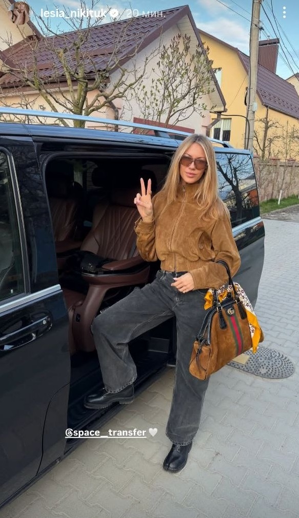 Особливу увагу в образі привертають аксесуари. Нікітюк обрала вінтажну сумку Gucci з фірмовою червоно-зеленою смугою і замшевими вставками. Вона гармонійно перегукується з курткою та підсилює загальну стилістику образу.