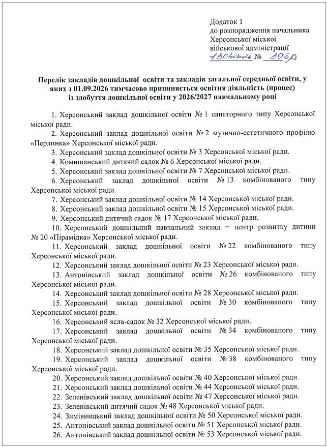 Перелік 49 закладів дошкільної освіти та закладів загальної середньої освіти, в яких з 01.09.2026 тимчасово припиняється освітня діяльність (процес) зі здобуття дошкільної освіти у 2026/2027 навчальному році, такий:
