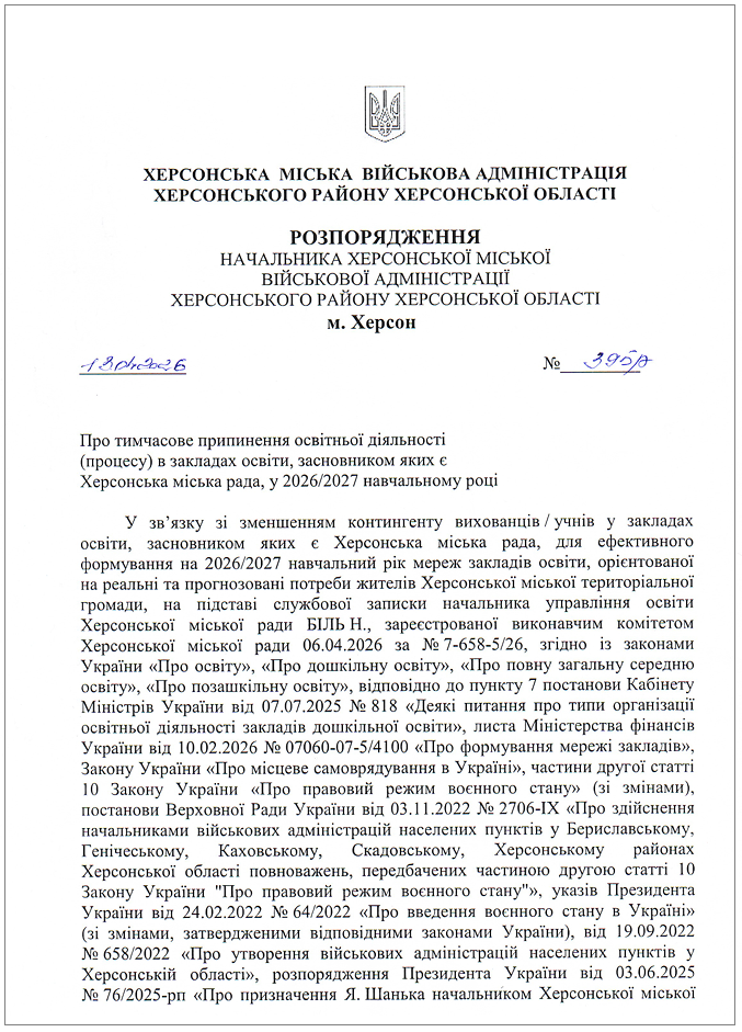 З 1 вересня 2026 року у Херсоні закриється чимала кількість шкіл і садочків. Працювати тимчасово перестануть також деякі заклади позашкільної освіти.