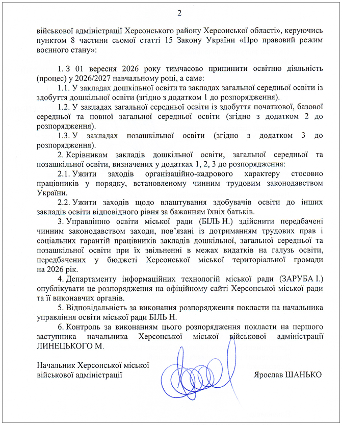 Про це повідомляє РБК-Україна із посиланням на розпорядження начальника Херсонської міської військової адміністрації (МВА) Ярослава Шанька.