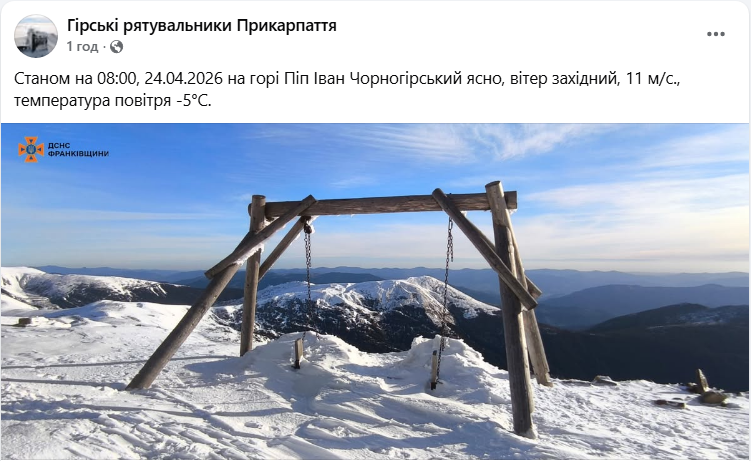 Згідно з інформацією гірських рятувальників Прикарпаття (оприлюдненою у Facebook), на горі Піп Іван Чорногірський - станом на 08:00 24 квітня 2026 року - погода була ясна.