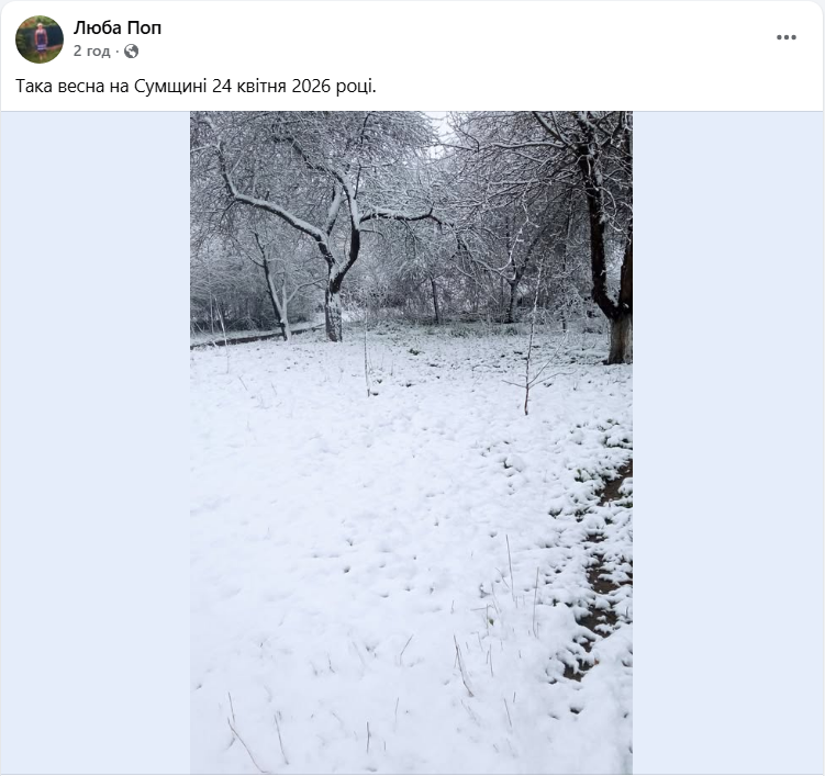 Сніг 24 квітня у Сумській області (скриншот: facebook.com/luba.pop.307703)