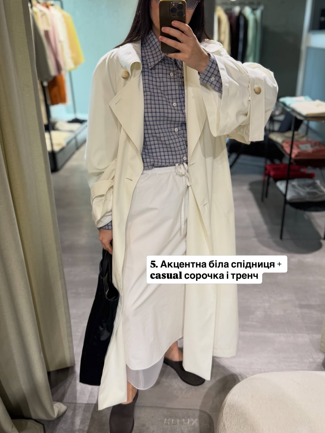 Легкі тканини створюють відчуття комфорту, а тренч збирає силует і додає структури.