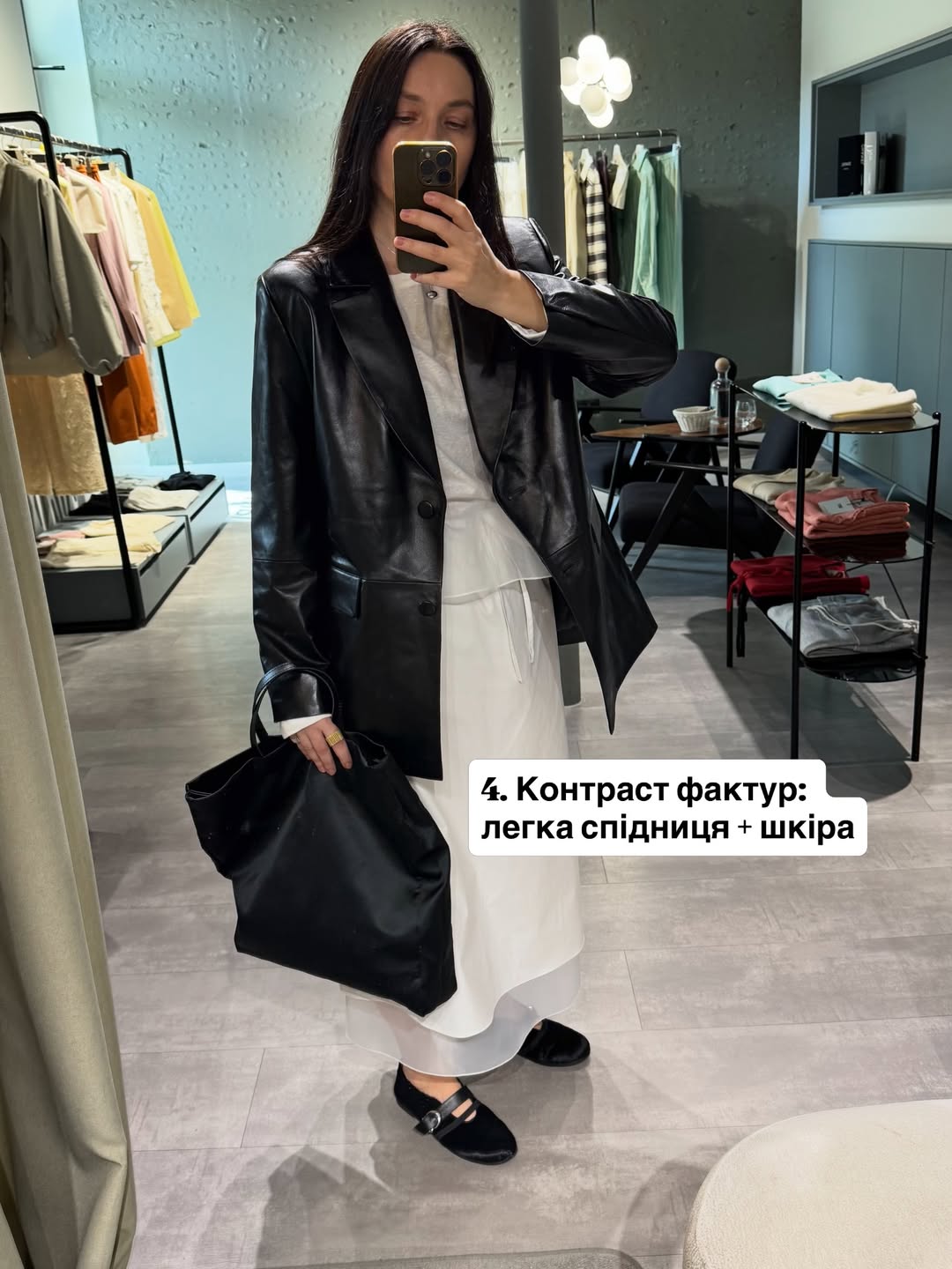 Один із ключових трендів сезону - поєднання різних фактур. Легка, майже повітряна спідниця створює рух і жіночність, тоді як шкіряний жакет додає жорсткості.