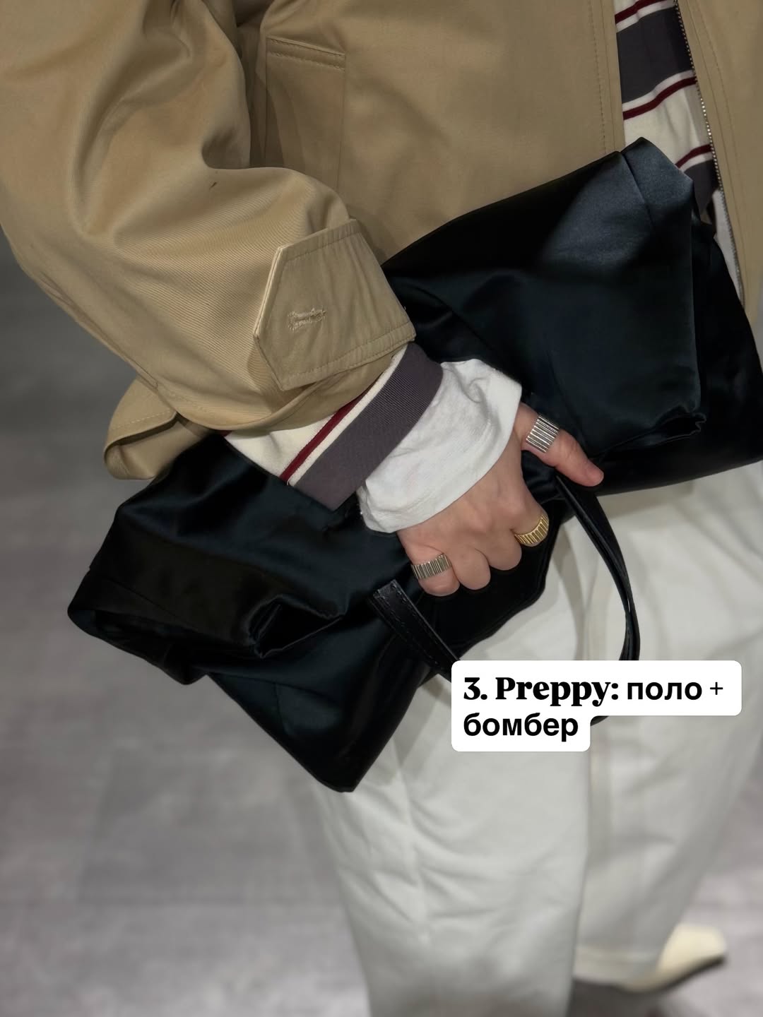 Стиль Preppy повертається у сучасному прочитанні. Поло в горизонтальну смужку стає акцентом образу, а бомбер додає спортивної динаміки.